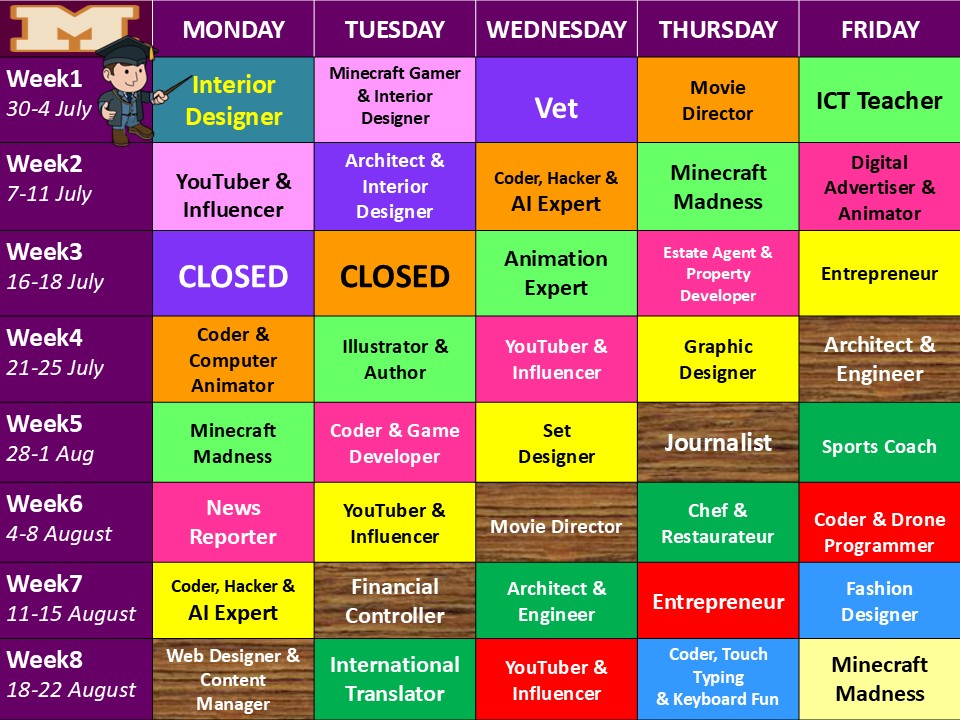 Each day is run as a new 1-day course that's based on a particular career, for example 'Architect for a day'. With demonstrations and a variety of tasks Children tasks covered throughout the session, children will produce a piece of work which is then presented to the class during the afternoon 'show'. Finally, there will be a prize giving with the opportunity for children to win stickers, USB's and CAPS.